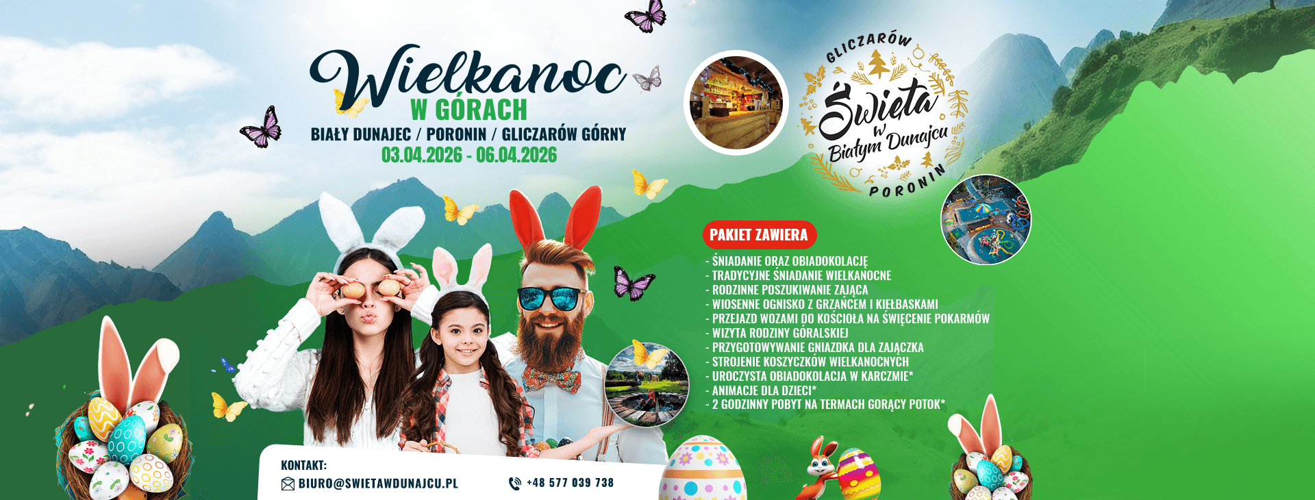 Spędź te wyjątkowe, radosne Święta Wielkanocne w górach z rodziną i bliskimi. Podczas pobytu wielkanocnego w Tatrach zapewniamy zakwaterowanie, wyżywienie, tradycyjne śniadanie wielkanocne, uroczystą kolację z regionalnymi potrawami, przejazd wozami na święcenie pokarmów imprezę w karczmie góralskiej oraz wstęp na baseny termalne. Ponadto dla dzieci: przygotowywanie koszyczków wielkanocnych, poszukiwanie jajek z zajączkiem wielkanocnym, animacje oraz warsztaty tworzenia ozdób świątecznych.